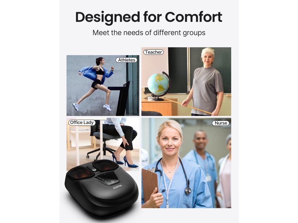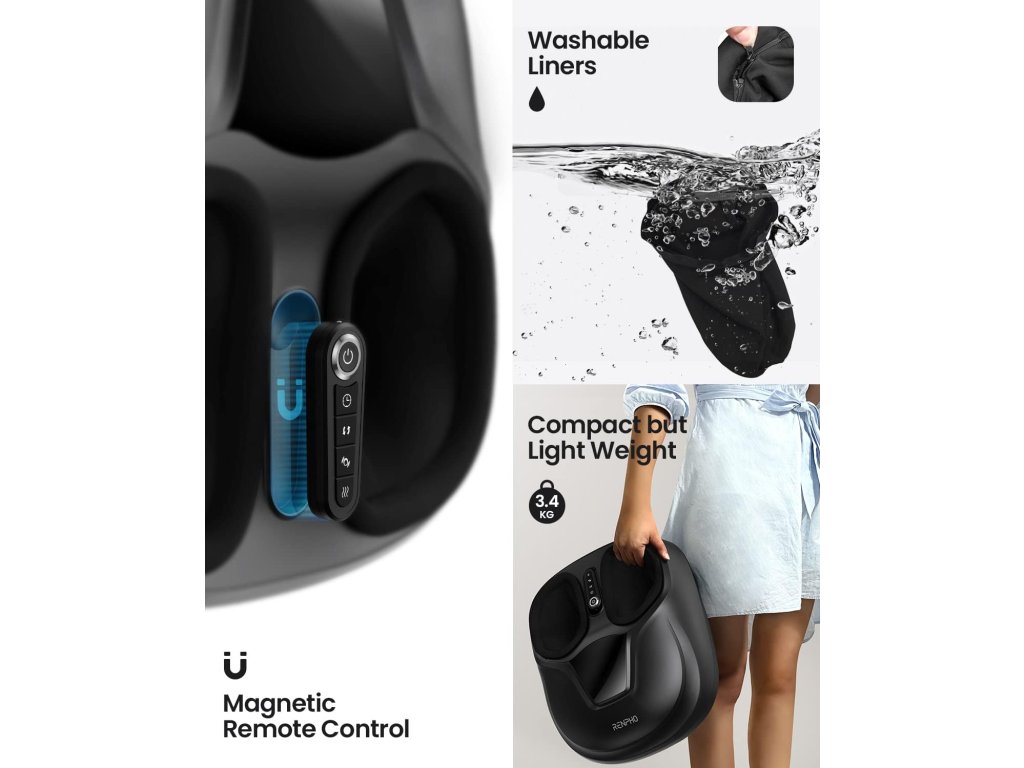- Hygienické čištění a kompaktní design. Vyjímatelné a pratelné síťové vložky umožňují snadné čištění a zajišťují hygienickou masáž nohou. Masážní přístroj váží pouze 3,4 kg, takže jej můžete snadno nosit.