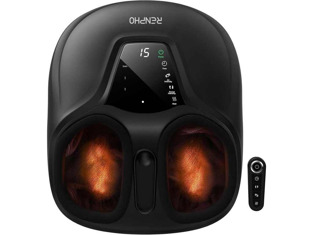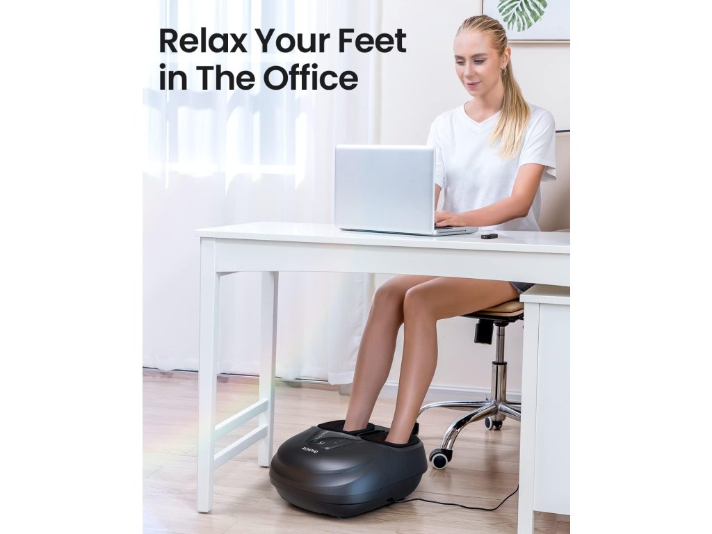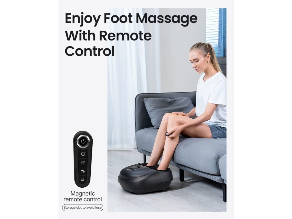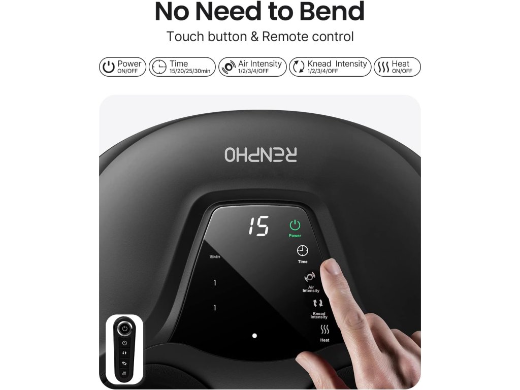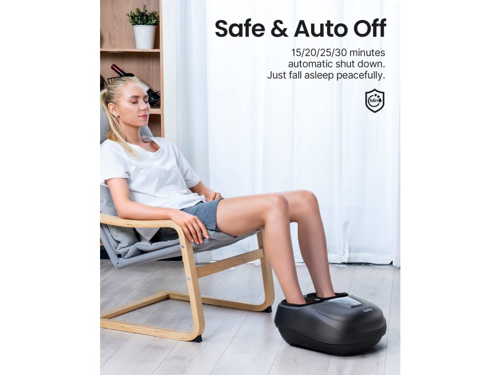 - Uklidňující funkce tepla a časovač automatického vypnutí. Dosáhněte hlubšího relaxačního stavu tím, že aktivujete volitelnou funkci tepla, která se během masáže vašich nohou zahřeje až na 50 °C. Vyberte si provozní dobu (15, 20, 25 nebo 30 minut) pro bezpečnější masáž chodidel doma nebo v práci. Upozornění: Výše uvedená nastavení hnětení, lisování a zahřívání lze ovládat nezávisle na sobě.