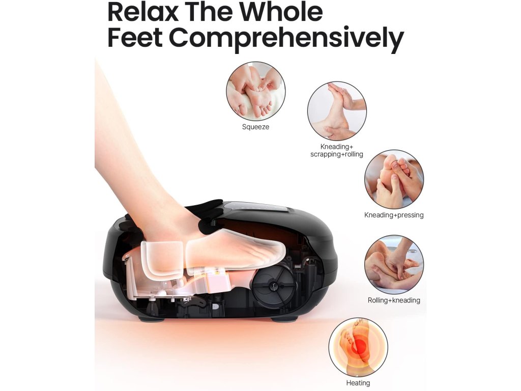 - Profesionální masážní přístroj na nohy. Vybaveno rotační kuličkou, válečkem a topením pro ultimativní masáž 3 v 1 pro vaše nohy. Tento shiatsu masážní přístroj na nohy nabízí pohodlnou a komplexní masáž chodidel se 4 intenzitami hnětení a 4 intenzitami tlaku. Efektivně uvolňuje vaše unavené chodidla a zmírňuje bolesti nohou díky plantární fasciitidě.