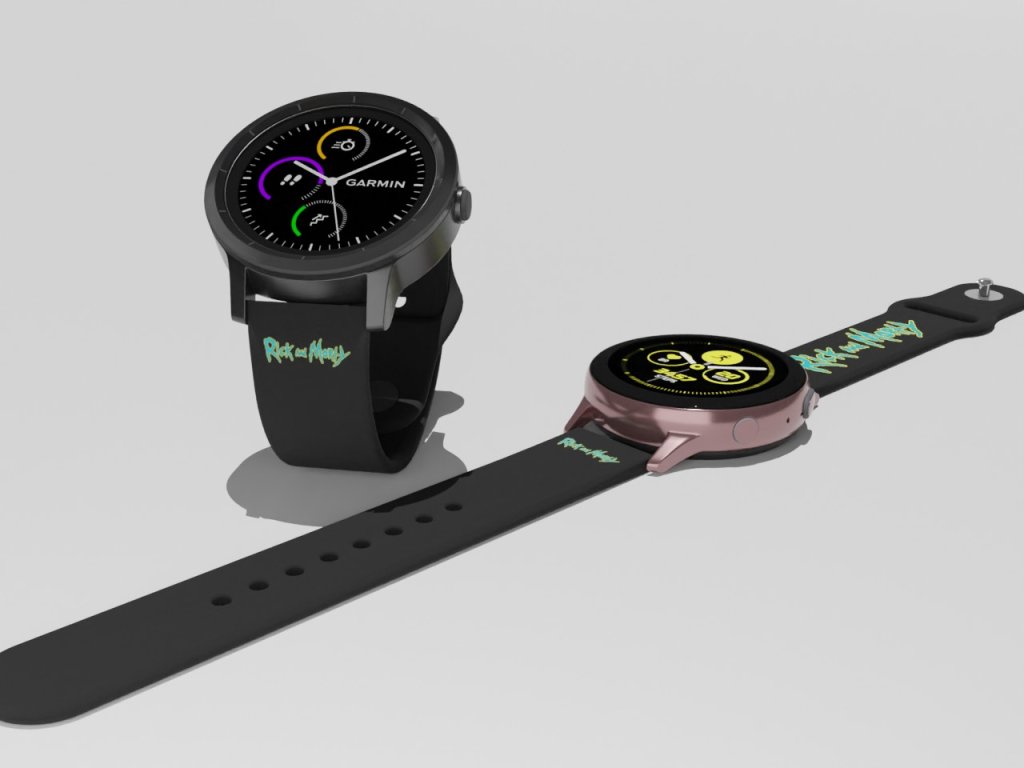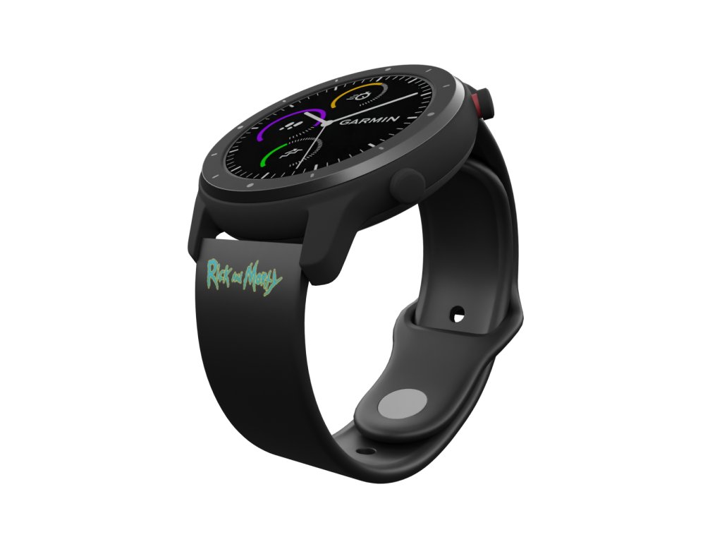 Černý náhradní řemínek pro chytré hodinky s modrým potiskem nápisu Rick and Morty.