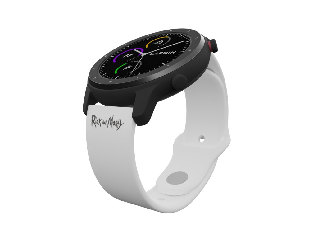 Bílý náhradní řemínek pro chytré hodinky s černým potiskem nápisu Rick and Morty. Prožijte dobrodružství mezi paralelními světy a dimenzemi.