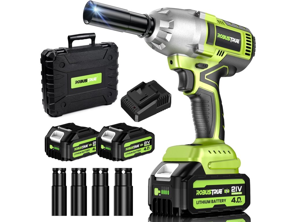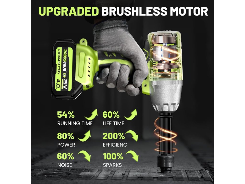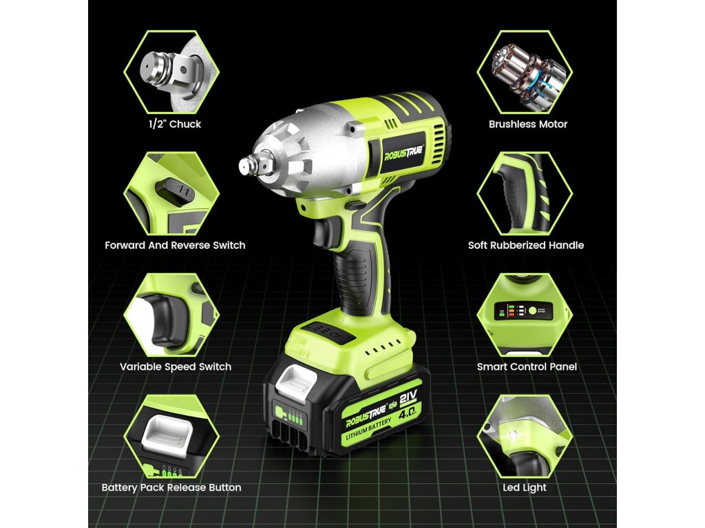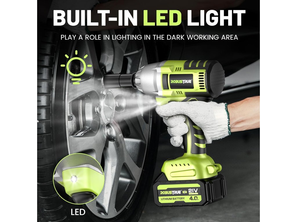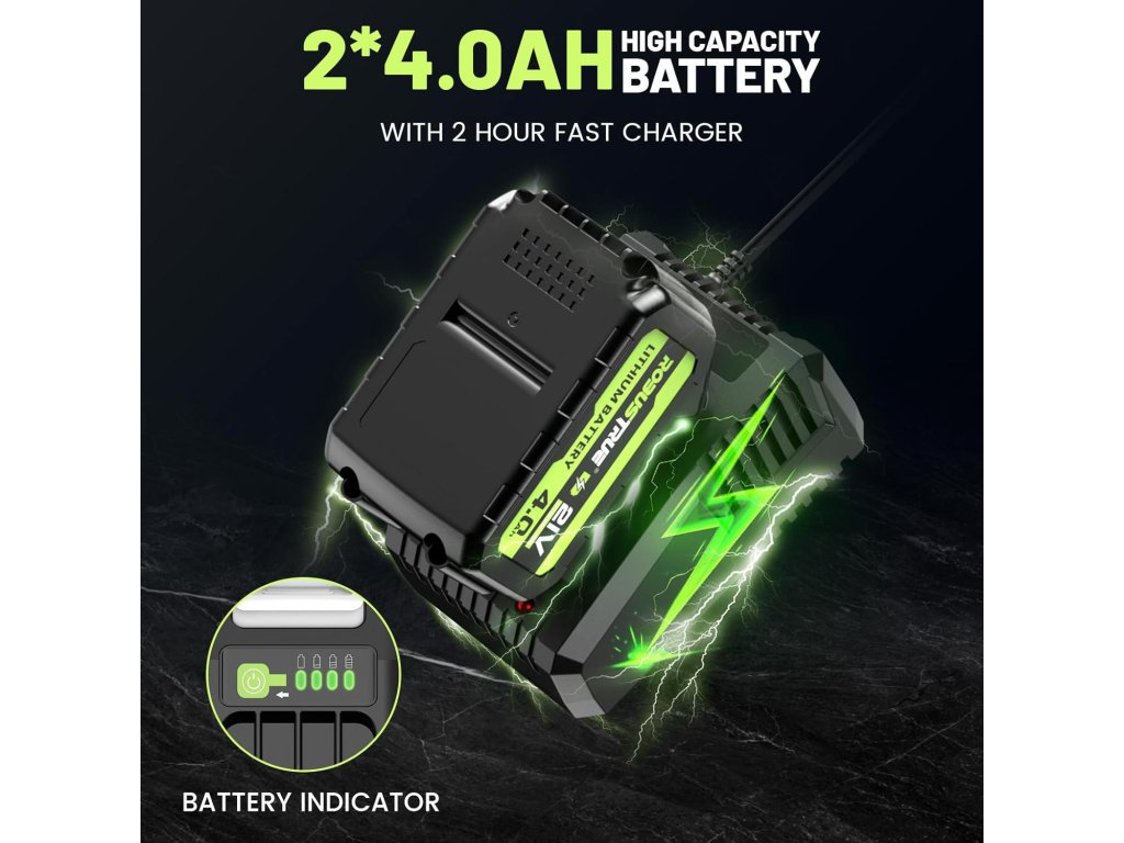 - 【2× 4,0 Ah akumulátor a rychlonabíjecí zařízení】 Příklepový šroubovák Robustrue je vybaven bateriemi 2 x 4,0 Ah včetně indikátoru kapacity, díky čemuž lze snadno zkontrolovat zbývající výkon. Baterie 4,0 Ah vylepšená po dlouhou dobu ve srovnání s akumulátorem 2,0 Ah nebo 3,0 Ah pro 7 až 8 hodin nepřetržitého provozu. Druhá baterie zajišťuje, že váš akumulátorový rázový šroubovák je vždy připraven k použití. Baterie 4,0 Ah potřebuje pouze 1 hodinu na plné nabití