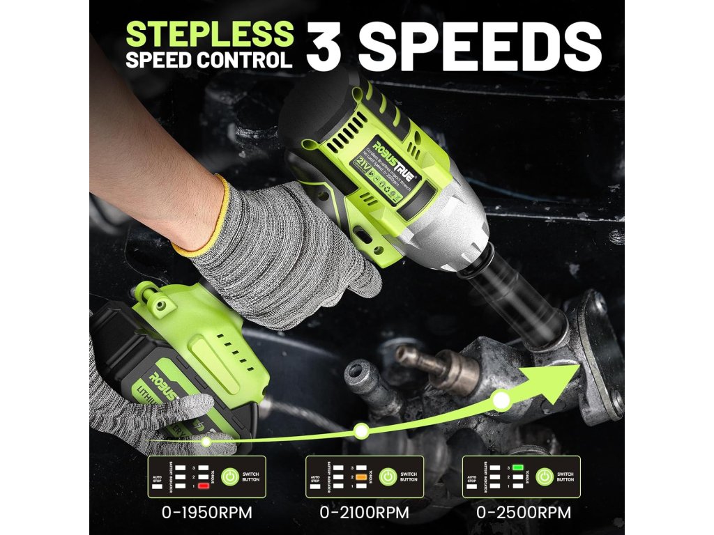 - ⚡️【3 nastavitelné rychlosti】Tento elektrický rázový šroubovák má 3 rychlostní stupně 0-1950/2100/2500 ot/min, vhodný pro odstraňování pneumatik, oprav automobilů a stavebních projektů. Rychlost nástroje lze zvýšit zvýšením tlaku na spouštěč spínače