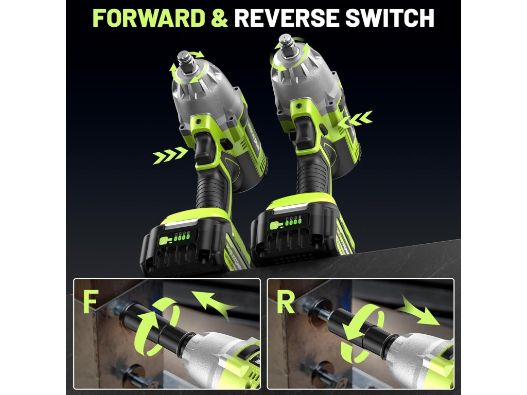 - 【Dva směry a zastavení brzdění】 Tento bezdrátový rázový šroubovák 1/2 se šrouby a šrouby. Pokud chcete přepnout do bezpečného režimu, přesuňte knoflík do středu. Při režimu vyšroubování se aktivuje brzdový zámek a snižuje rychlost a točivý moment, jakmile se matice nebo šroub uvolní. Na takovou vlastnost matice nespadne a chrání závit šroubu