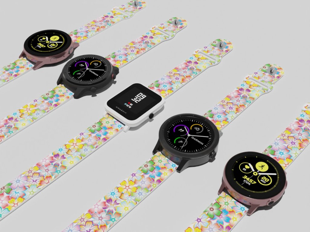 Bílý náhradní řemínek pro chytré hodinky s celopotiskem rozkvetlých kytiček.