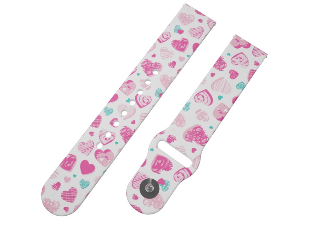 Bílá náhradní řemínek s grafikou modrých a růžových srdíček. Jemné pohlazení