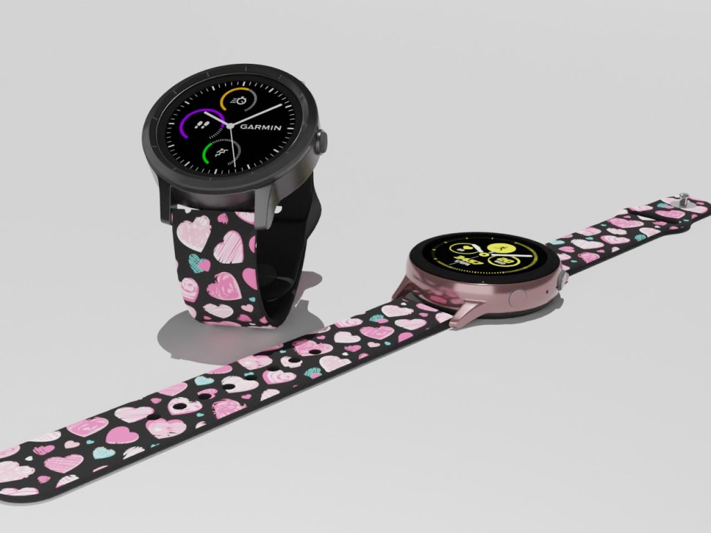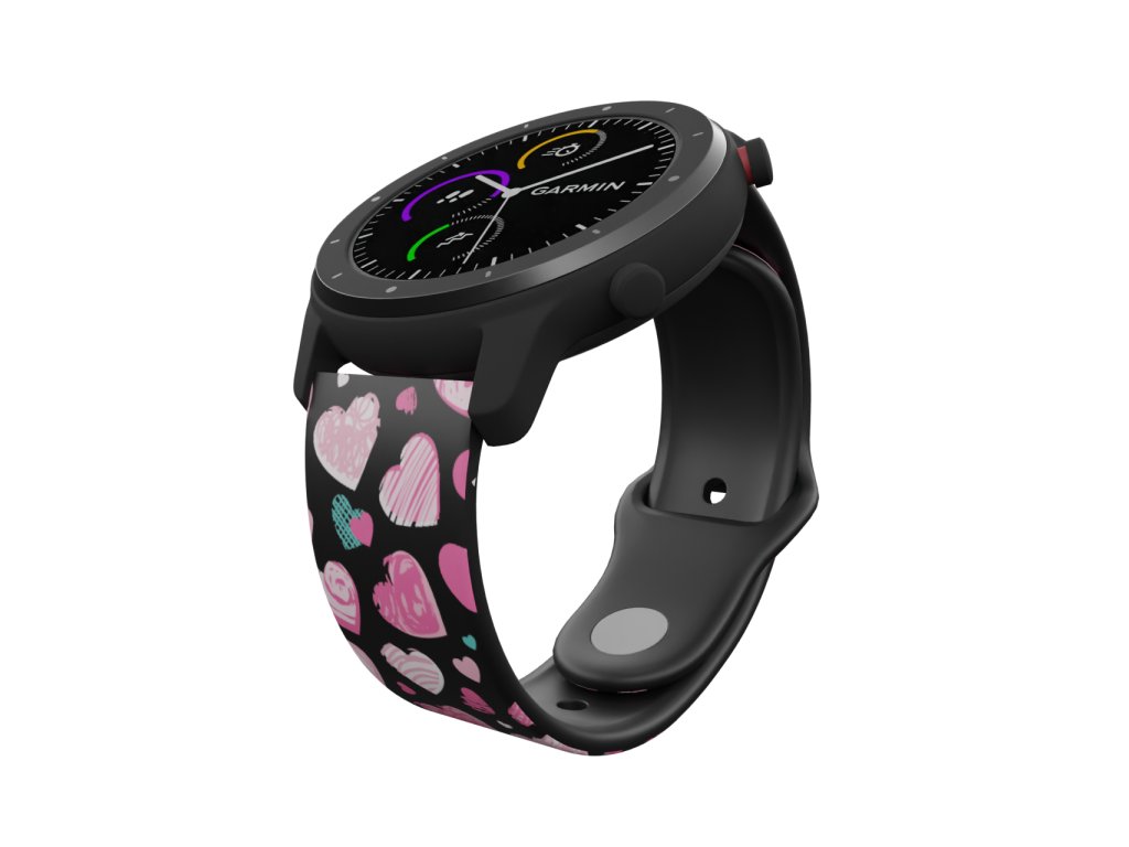 Černý náhradní řemínek s grafikou růžových a modrých srdíček. Vzplaňte láskou v tónech