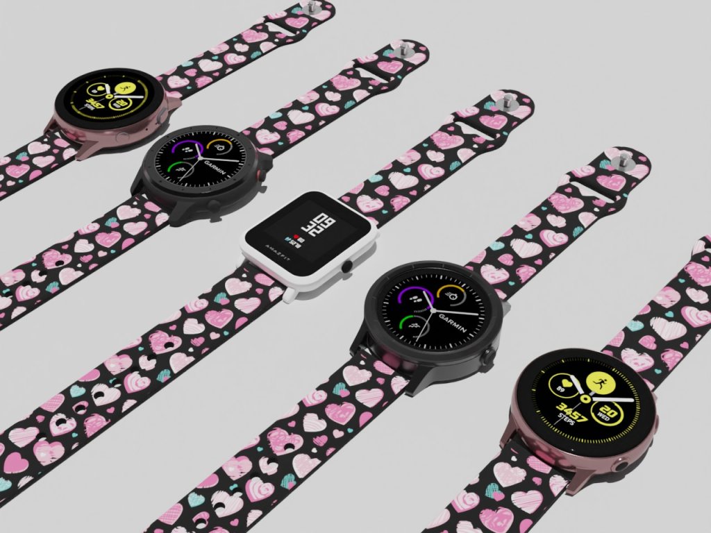 Černý náhradní řemínek s grafikou růžových a modrých srdíček. Vzplaňte láskou v tónech růžové a modré.