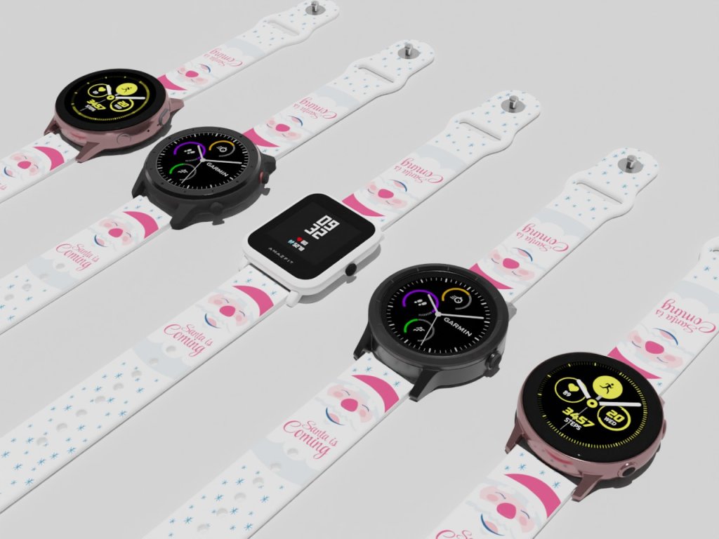 Bílý náhradní řemínek pro chytré hodinky s potiskem Santy a sněhových vloček. Veselé Vánoce a dárky celý rok.