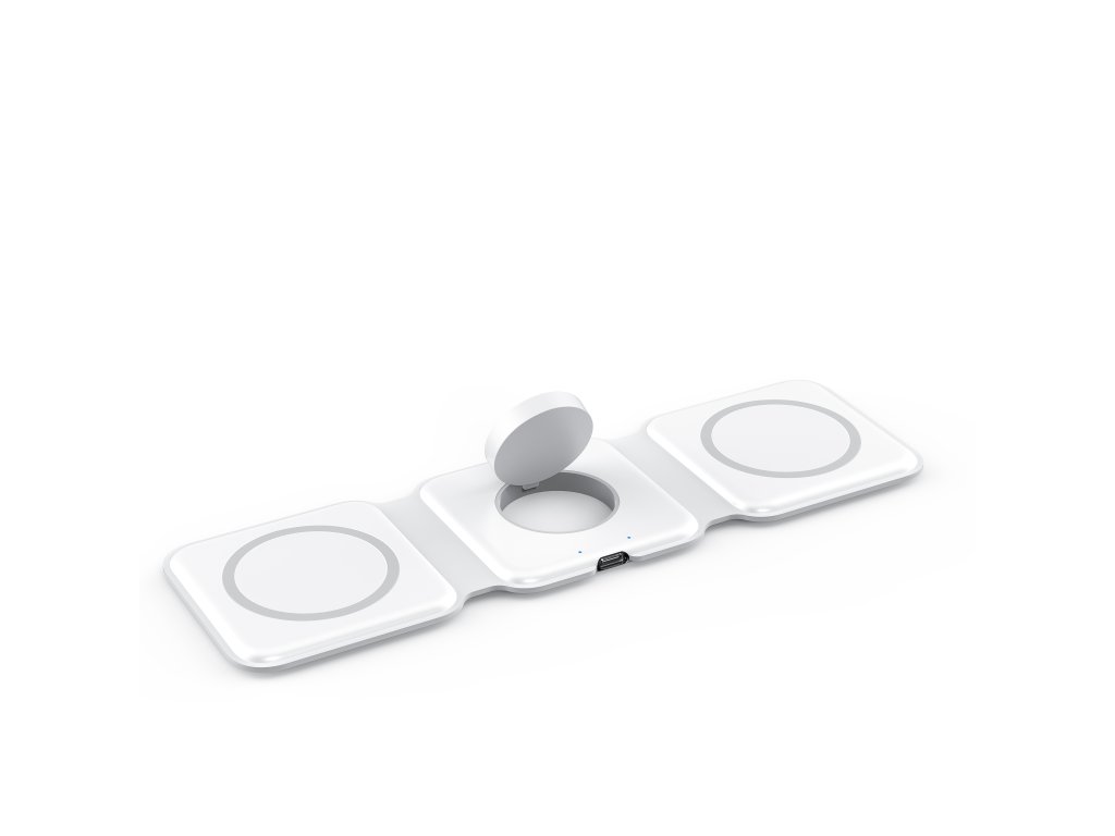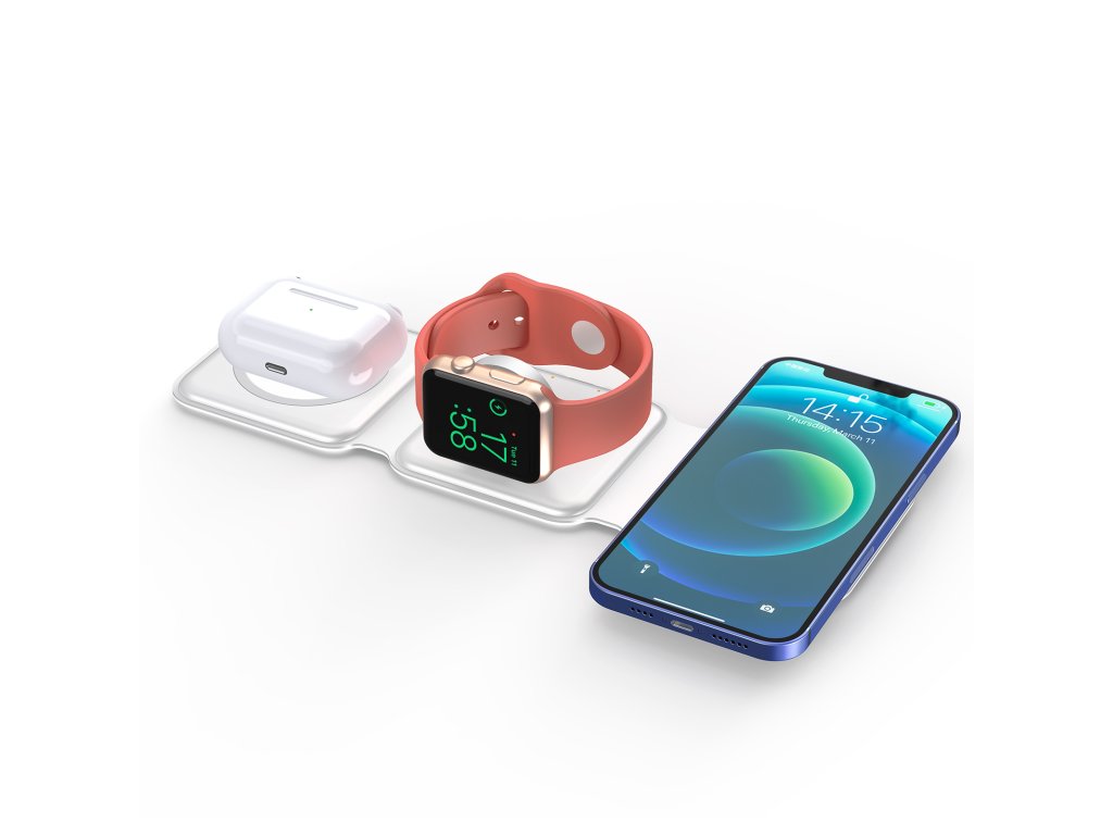 Skládací bezdrátová nabíječka vhodná pro nabíjení telefonů, Apple Watch hodinek a sluchátek AirPods.