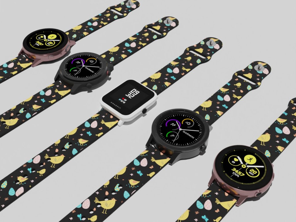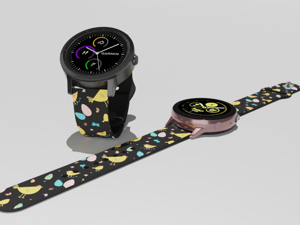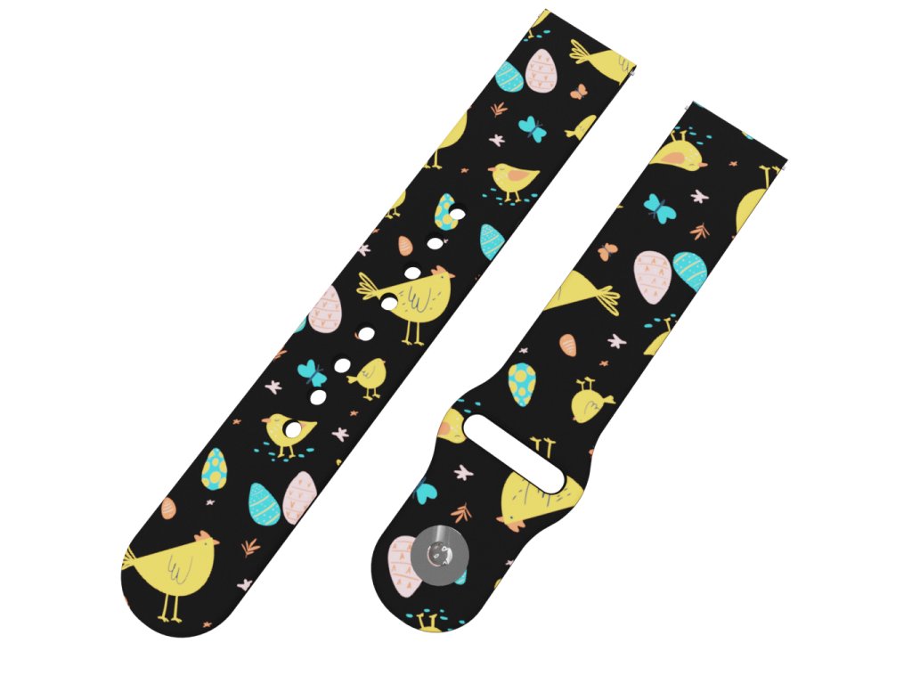 Černý náhradní řemínek pro chytré hodinky s potiskem barevných slepiček.