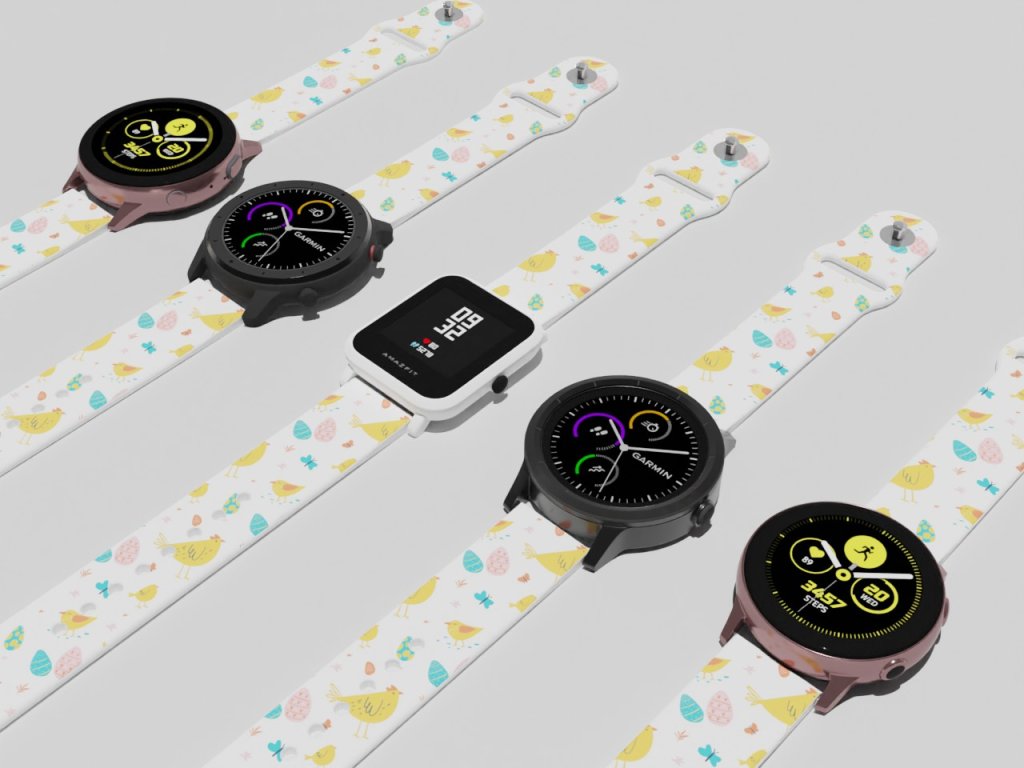 Bílý náhradní řemínek pro chytré hodinky s potiskem barevných slepiček.