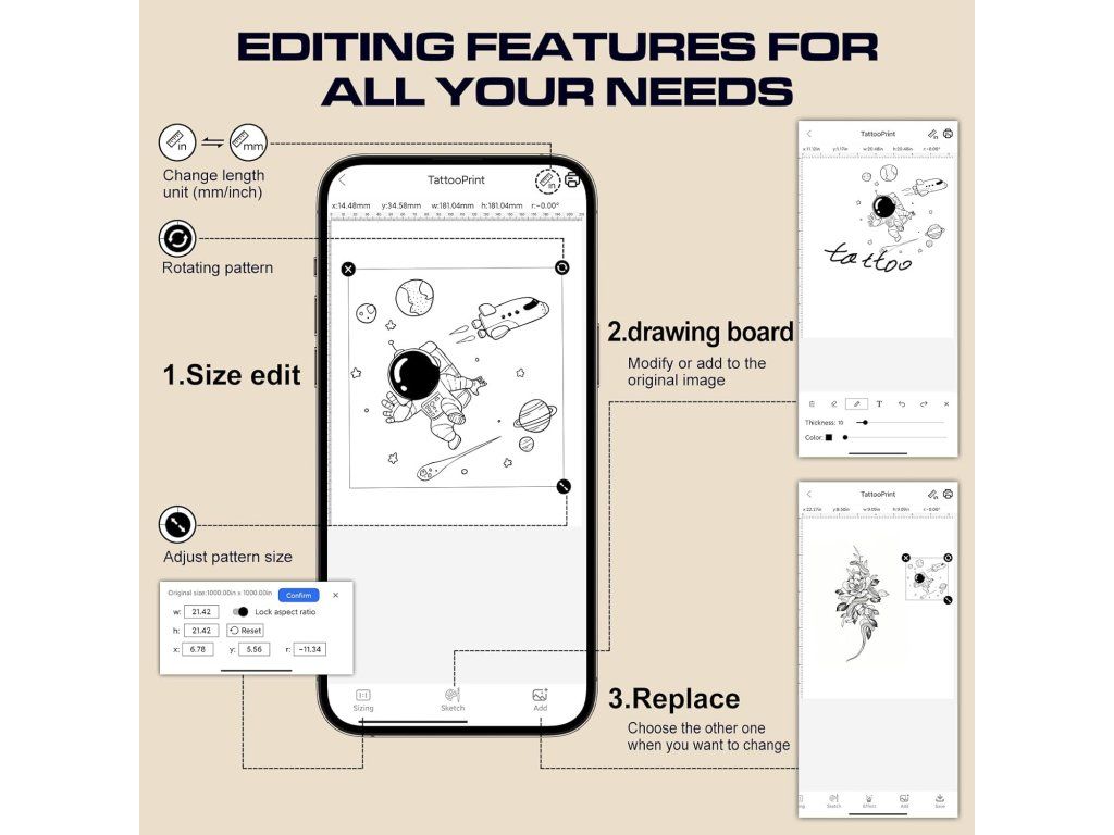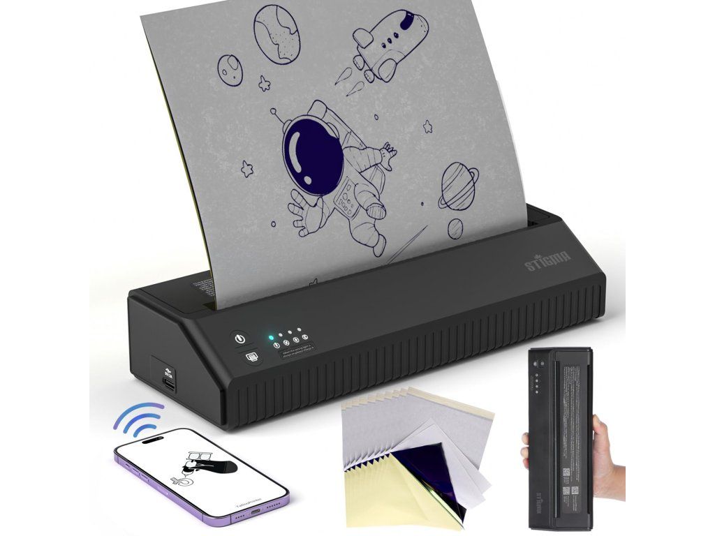 Zařízení využívá termální tisk, takže není potřeba inkoust ani toner. Kompaktní rozměry a nízká hmotnost z ní dělají ideální nástroj pro profesionální tatéry i domácí použití.