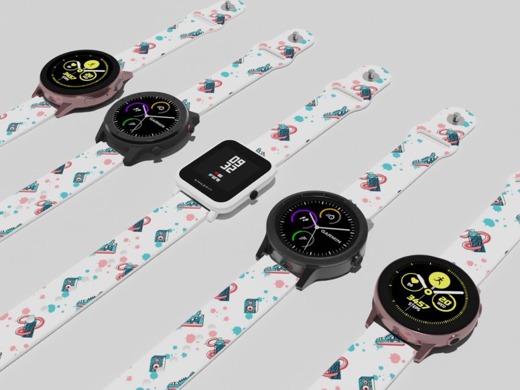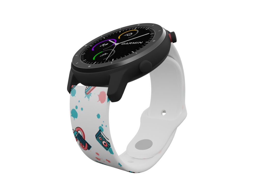 Bílý náhradní řemínek pro chytré hodinky s potiskem prvků street style.