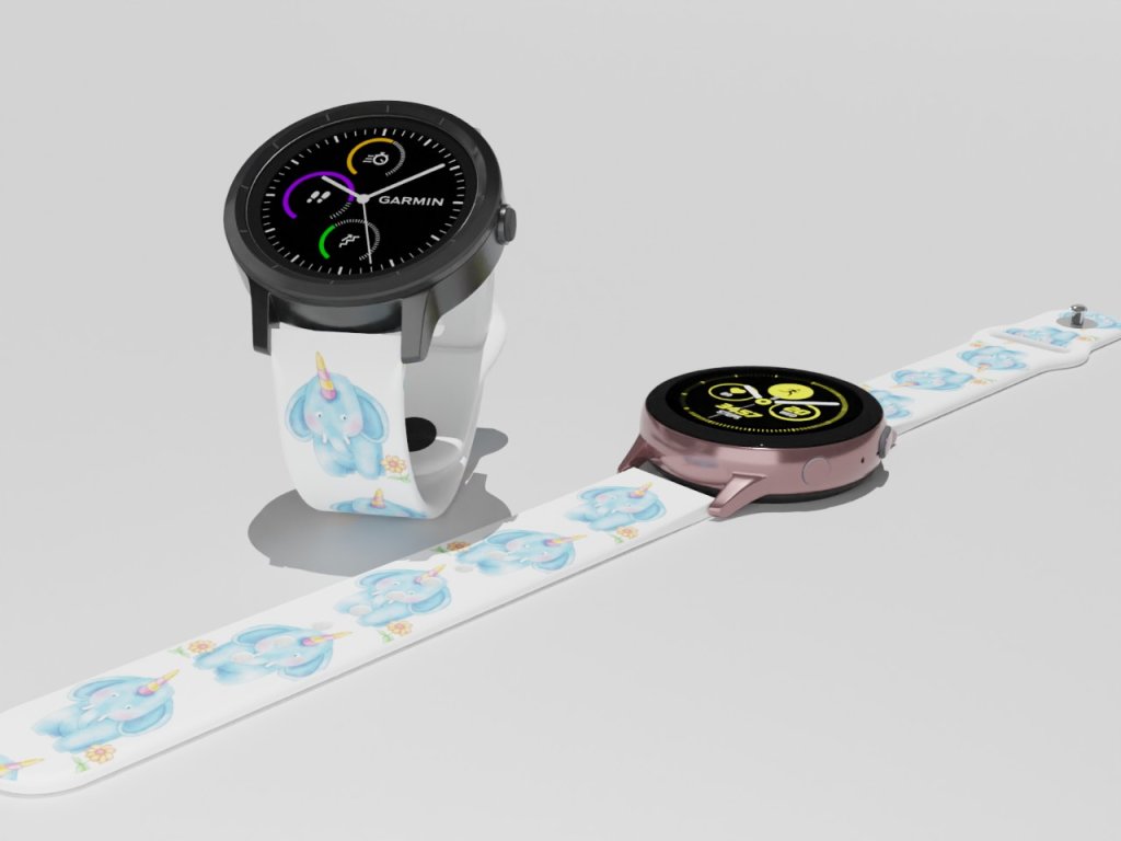 Bílý náhradní řemínek pro chytré hodinky s potiskem křížence slona a jednorožce. Přivítejte na světě nového tvora Unifanta.