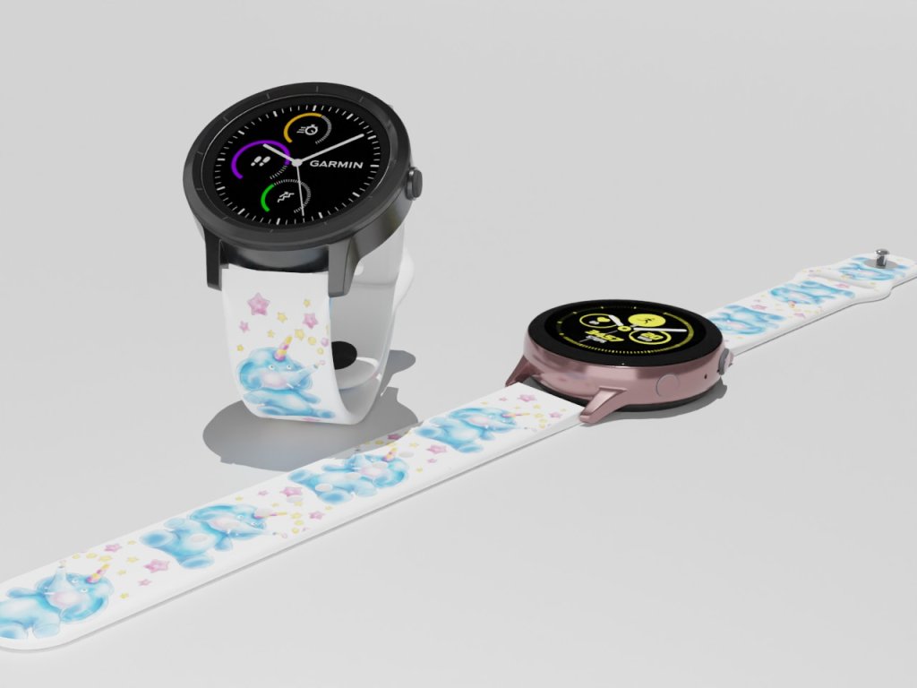 Bílý náhradní řemínek pro chytré hodinky s potiskem křížence slona a jednorožce. Zcela jedinečný a unikátní Unifant.