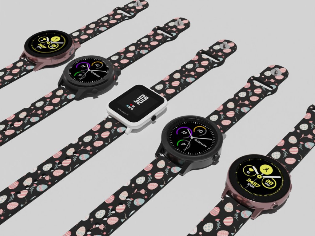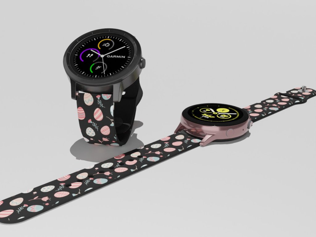 Černý náhradní řemínek pro chytré hodinky s potiskem vajíček a kytiček