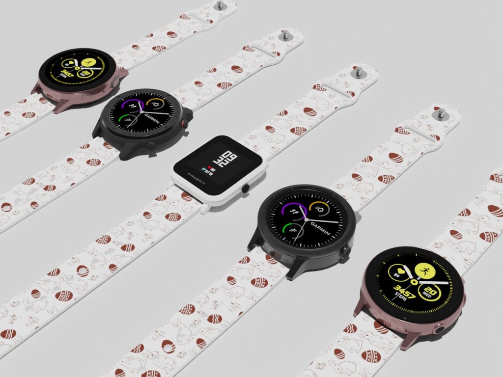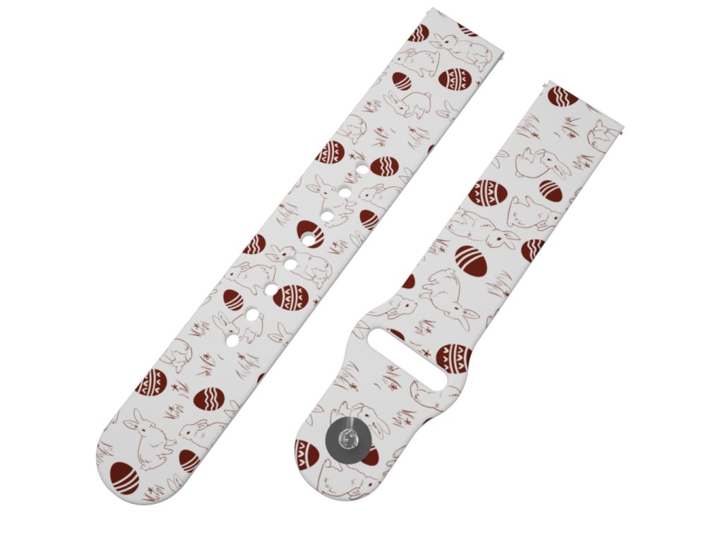 Bílý náhradní řemínek pro chytré hodinky s potiskem prvků Velikonoc v hnědé barvě. Hody, hody, doprovody...velikonoční vajíčka a zajíčci pro vaše chytré hodinky.