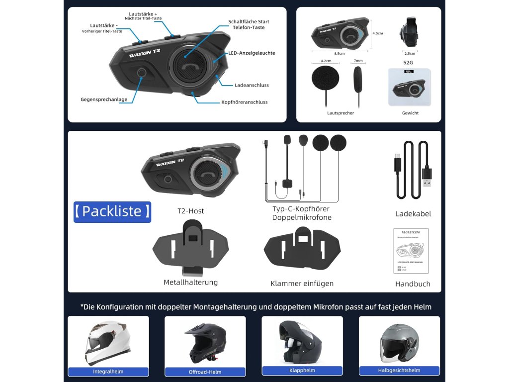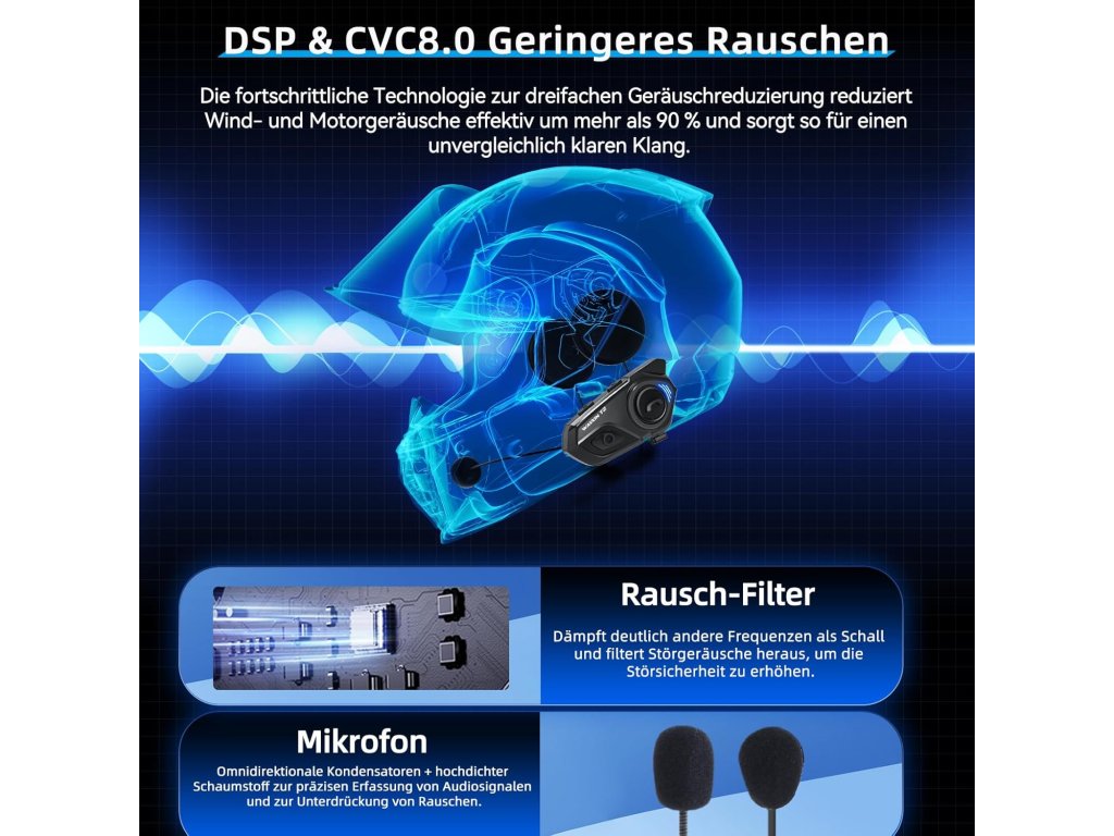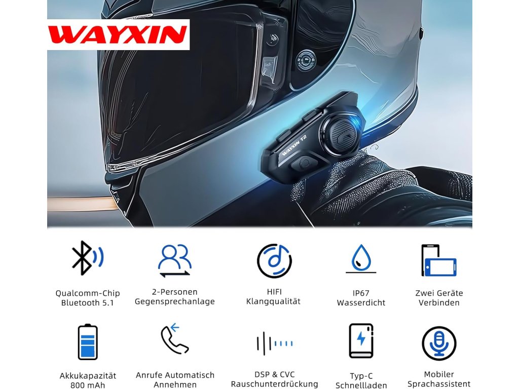 - 【Technologie potlačení šumu DSP/CVC]】 Náhlavní souprava pro dvě osoby WAYXIN T2 integruje technologii DSP a CVC, která efektivně filtruje okolní bas. Tak budete i na dálnici nebo v horských křivkách vždy slyšet jasné hlasy svého doprovodu a hudby – pro čistý HiFi zvuk jako v obývacím pokoji