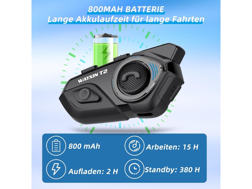 - 【 Baterie a ochrana IP67】 Motocyklový intercom T2 má baterii 600 mAh na 15 hod. Hudba, 10 hod. nepřetržité hovory a 380 hodin Pohotovostní režim – plně nabitý za pouhé 2,5 hodiny. S certifikací IP67 je kompletně vodotěsný a prachotěsný. Jednoduše udržujte přípojky v suchu a užívejte si bezstarostnou radost z jízdy