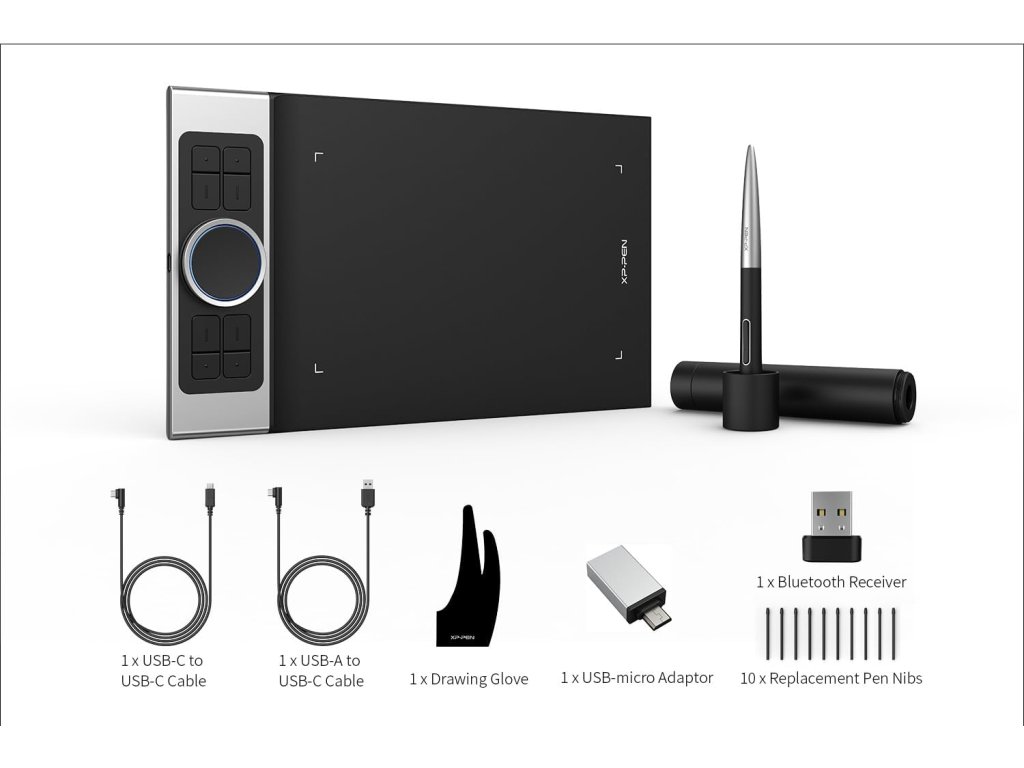| Součásti zahrnuty | 1 x pero Deco Pro, 1 x stylus bez baterií, 10 x náhradní hroty, 1 x držák pera, 1 x kabel USB-C na USB-C, 1 x kabel USB-A na USB-C, 1 x přijímač Bluetooth, 1 x adaptér USB-Micro, 1 x stručná úvodní příručka, 1 x stručná úvodní příručka (pro zařízení Android), 1 x kreslicí rukavice, 1 x záruční list |